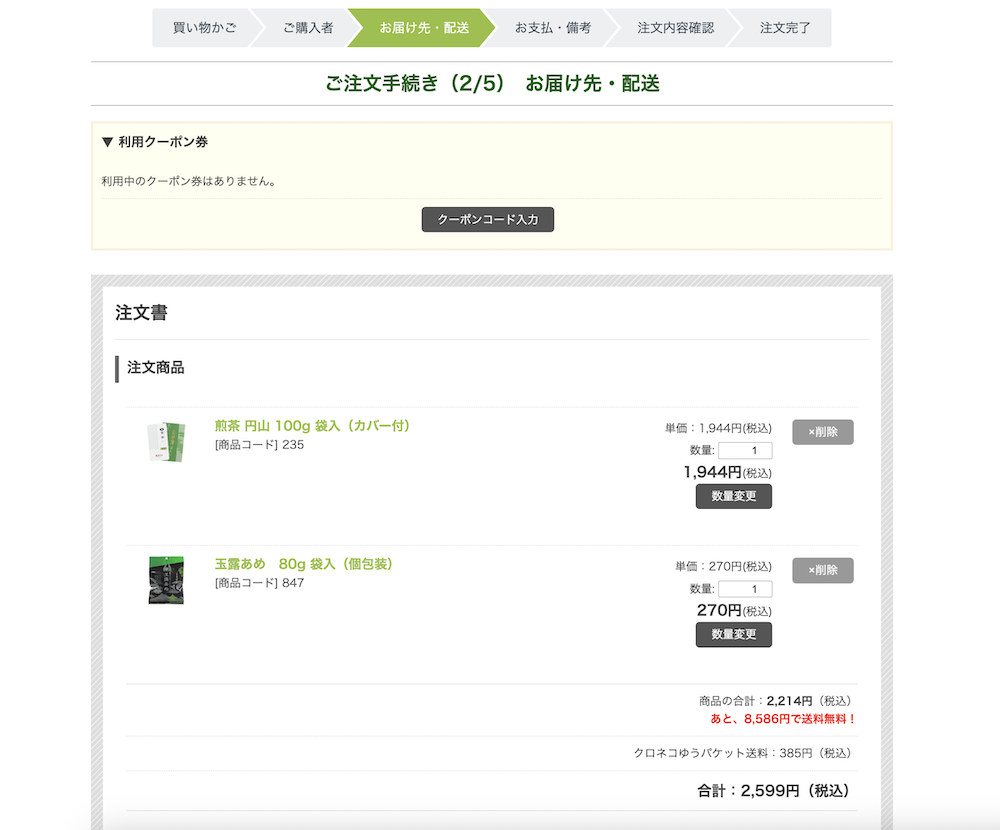 送料の欄がクロネコゆうパケットになっていることを確認し、ご注文手続きを進めてください。 ※同梱可能数を超えている場合や他の商品も一緒にご注文されている場合などはクロネコゆうパケットでの対応ができかねますので予めご了承くださいませ。